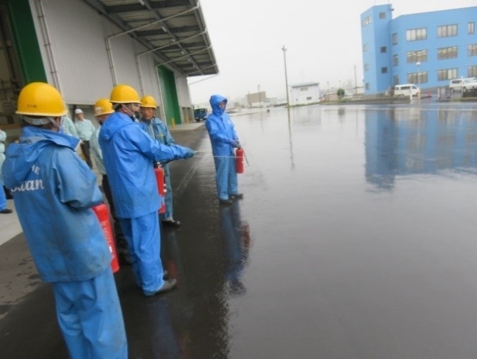 1号埠頭倉庫における7月の消防ポンプによる放水訓練に続いて、9月に通報連絡、初期消火、避難誘導などの総合訓練を実施しました。火災発生時に消防隊が現場に到着するまでの間に効果的な消防活動が実施できるよう熟練しておくことが大切です。実際に火災報知機のボタンを押し、消防本部の指令センターに「訓練火災です」と通報連絡、最後に訓練用消火器で操法を確認しました。