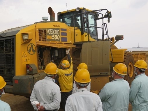 学科では動画を交え、正しい操作方法の確認や省エネ運転につながる効率の良い作業方法などを学び、実技ではエアクリーナーの清掃のタイミング、大気汚染を低減するために使用される高品位尿素水(アドブルー)の交換方法、グリースの効果的な注し方やポイントなどの説明を受けました。