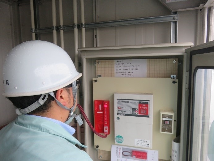 1号埠頭倉庫における7月の消防ポンプによる放水訓練に続いて、9月に通報連絡、初期消火、避難誘導などの総合訓練を実施しました。火災発生時に消防隊が現場に到着するまでの間に効果的な消防活動が実施できるよう熟練しておくことが大切です。実際に火災報知機のボタンを押し、消防本部の指令センターに「訓練火災です」と通報連絡、最後に訓練用消火器で操法を確認しました。